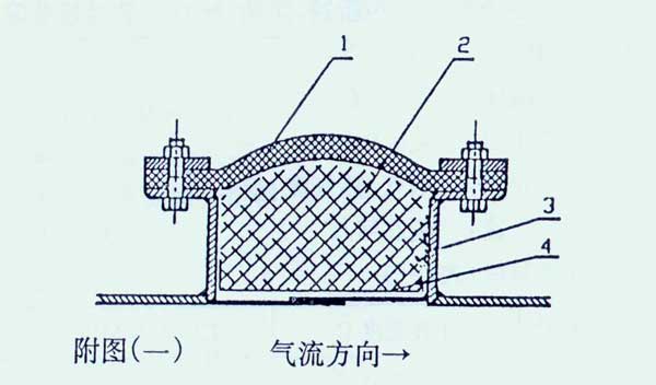 非金屬補(bǔ)償器是由:(1)非金屬?gòu)?fù)合圈帶 (2)隔熱填料層 (3)機(jī)架 (4)不銹鋼絲網(wǎng)等組成。見附圖。